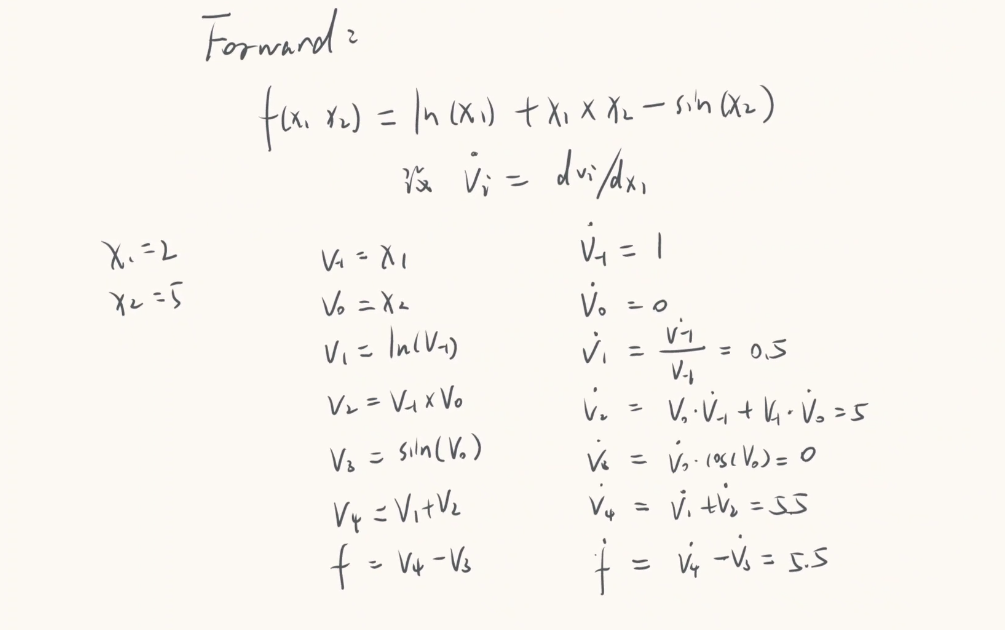 上面的过程只需要如下代码便能实现,在求出 f 的同时还能同步算好对 x1 的偏导,但是缺点也很明显,没办法同时求出对 x1 和 x2 的偏导。