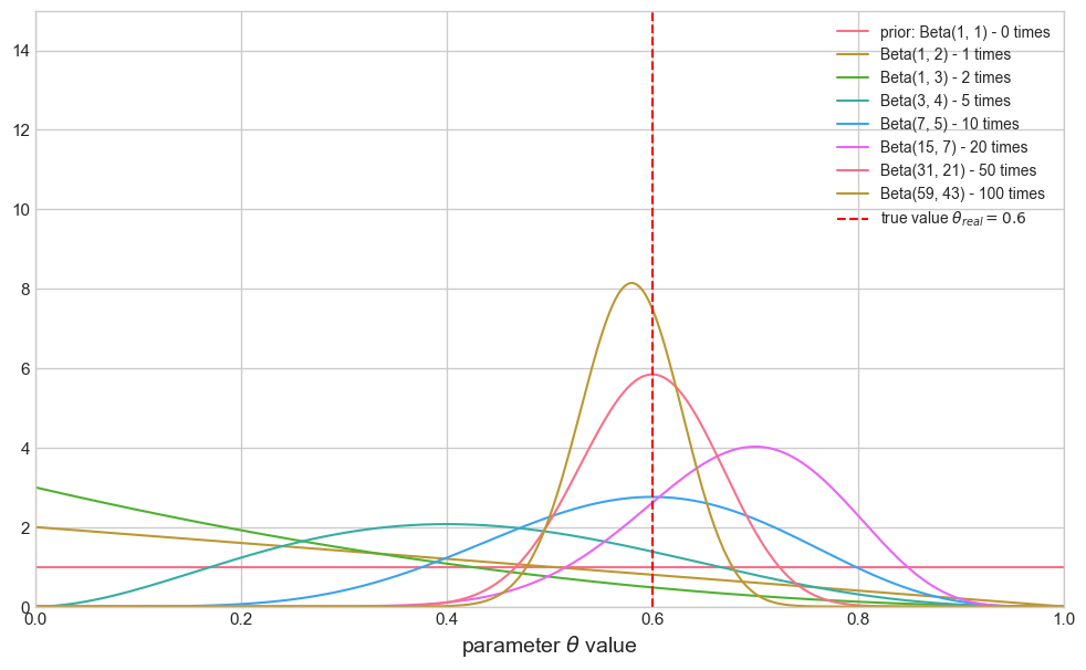 假设我们有一枚可能不均匀的硬币,我们想知道它正面朝上的真实概率 θ 是多少。为了搞清楚这个问题,我们进行了一系列抛硬币实验。