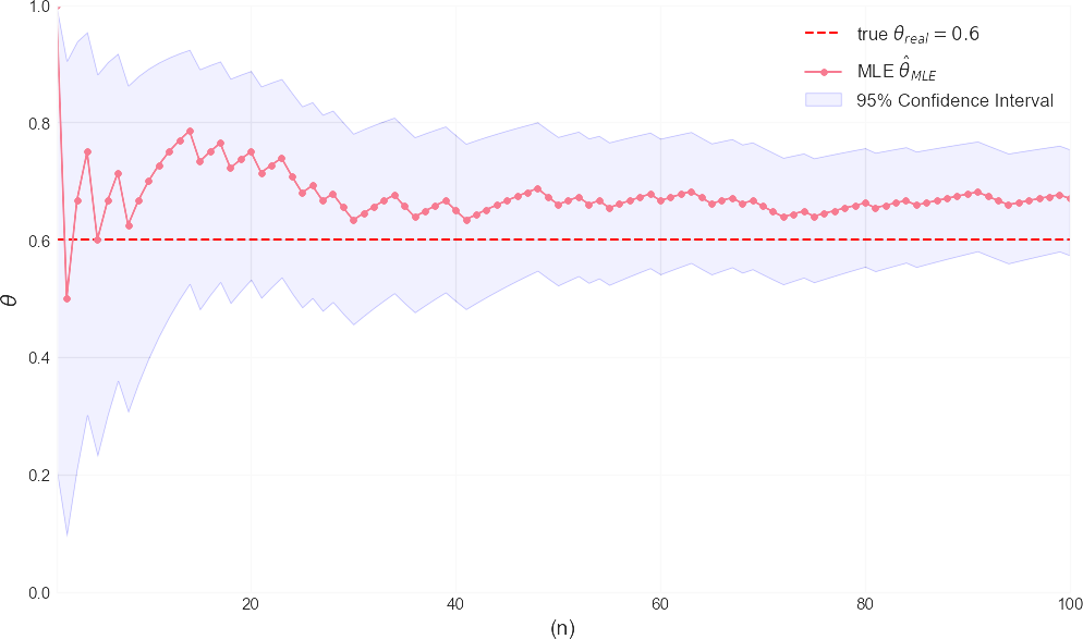 - 浅红色的点线是每次增加观测数据后,计算出的最大似然估计值 。你可以看到它随着数据量的增加,逐渐向红色的真实值 θ∗real 收敛。